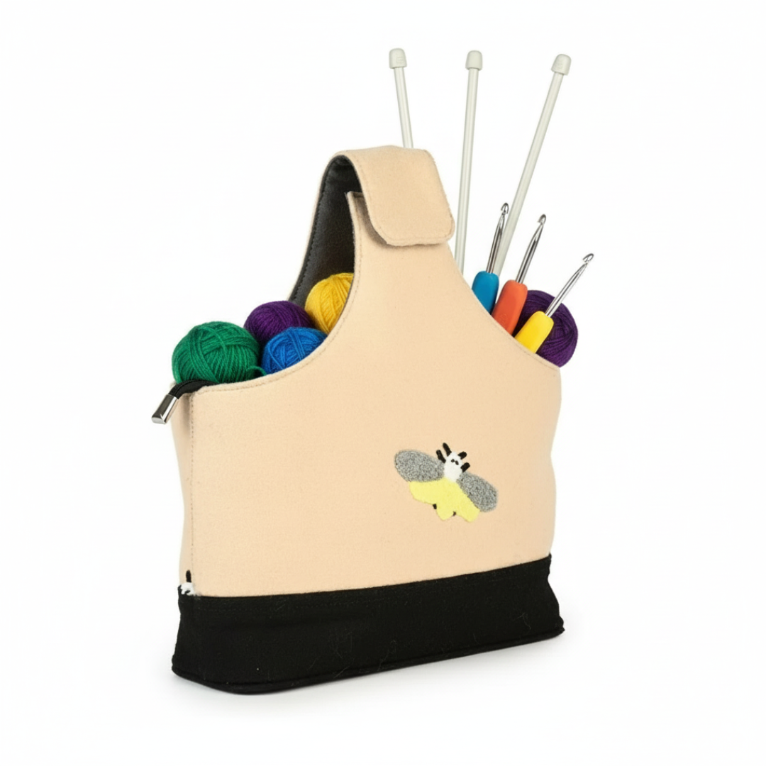 Descoperă geanta de mână KnitPro Bumblebee, accesoriul ideal pentru orice proiect creativ! Concepută special pentru pasionatele de tricotat și croșetat, această geantă îmbină utilitatea cu un design vesel și elegant din fetru cu broderie.