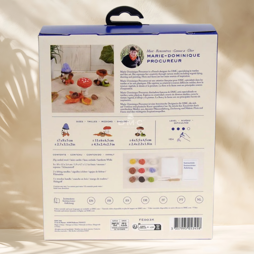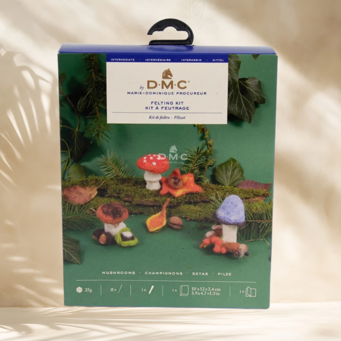 Intră în lumea felting-ului cu kitul DMC Mushrooms, perfect pentru pasionații de craft care vor să experimenteze tehnici noi și să creeze decorațiuni spectaculoase din lână împâslită. Acest kit conține tot ce ai nevoie pentru a realiza trei ciupercuțe colorate, ideale pentru decor, cadou sau relaxare creativă.