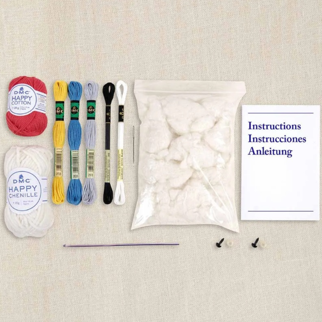 Totul inclus: Găsești în cutie toate materialele necesare – fire de bumbac și chenille, fire de broderie, croșetă, ac, ochi de siguranță, umplutură și instrucțiuni detaliate în mai multe limbi.
